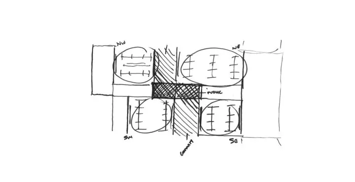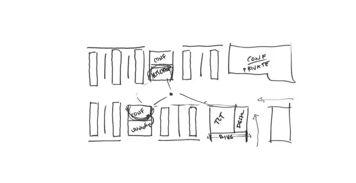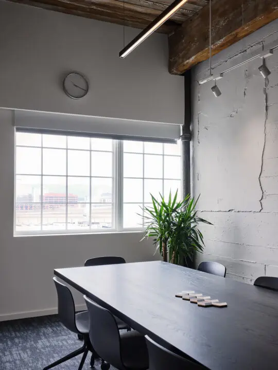 Located on the third floor of the Eastside Exchange building, what was originally an awkward U-shaped plan broken up into separate office suites is now an open office that facilitates collaboration and maintains intimate workstation “neighborhoods” without hierarchy. Working within the historic building’s 20-foot bay width, each six-foot-wide workstation maintains close access to daylight and views of downtown Portland or the burgeoning Burnside Bridgehead neighborhood.
