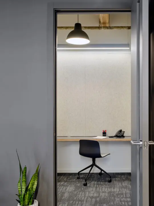 Glazing along the central public egress corridor, along with doors connecting to the library and kitchen, creates a visual and physical connection that enables circular flow through the office.