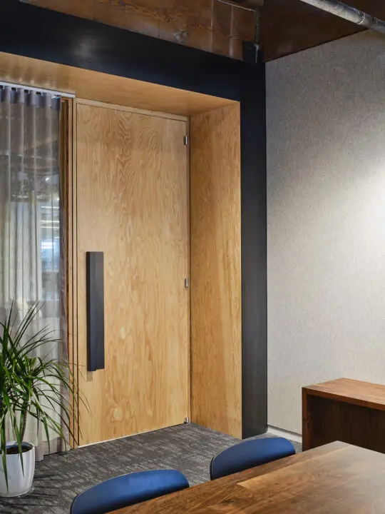 The interiors’ material approach takes cues from the former warehouse building’s industrial quality. A raw but refined aesthetic combines clear-coated steel, plywood, and a greyscale palette contrasted with plentiful greenery and sunlight throughout. This creates an appropriate, durable, sustainable, and long-lasting background for our work and daily activities to take center stage.