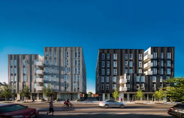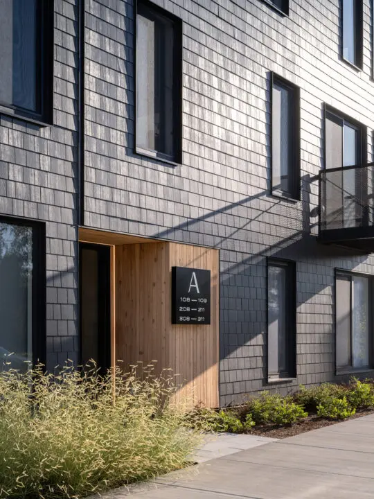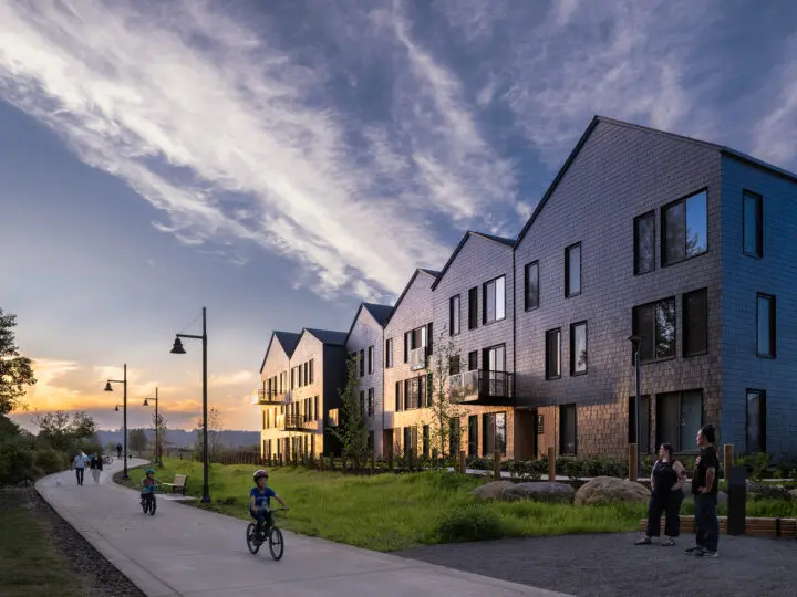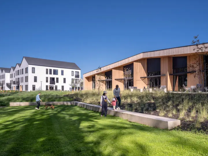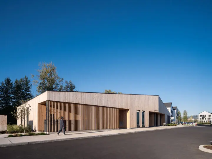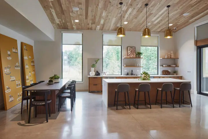 Sustainability was a high priority for the project, with the development earning several certifications, including the Riverside Retreat clubhouse, which is ILFI Net Zero Energy certified. The building features a dramatic sloped roofline and an abundance of amenities.