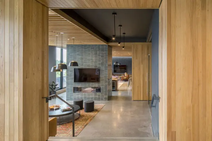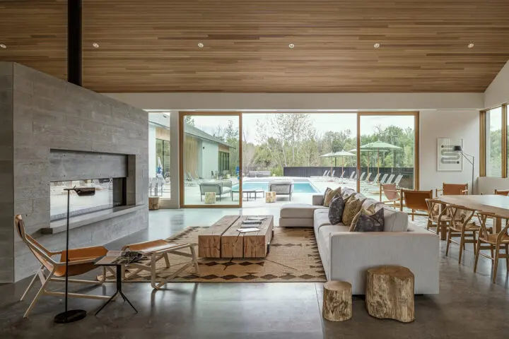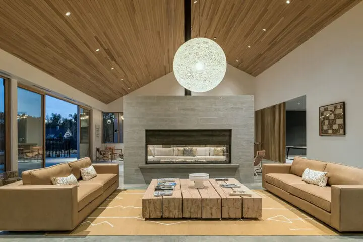 The community clubhouse, the Riverside Retreat, provides various spaces for gathering, connecting, working, and more. The main lounge invites residents and guests to gather around the central fireplace or find focus in private seating areas. A fully equipped fitness center and a shared gear shed with outdoor equipment for residents’ use.