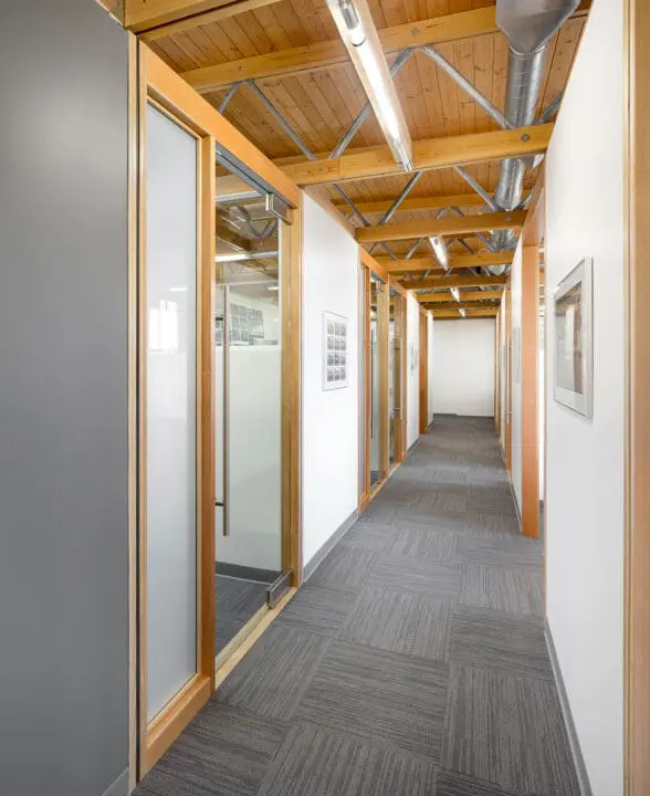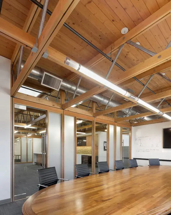 Previously, the third floor of Walsh’s office incorporated many underutilized spaces. Holst reimagined the use of the central receiving area and chose to highlight the building’s main attribute—exposed wood trusses—with lighting and an interior framework that aligns with the existing truss work. Existing office and conference spaces were opened up with additional windows and daylighting.