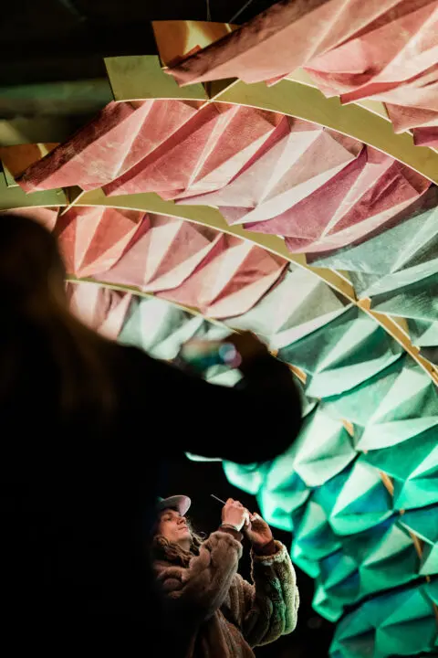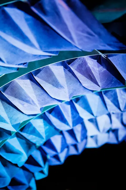 Paper folding inspired the design, which was refined through iterative physical models. The flat burlap sheets were cast and dyed, then folded to create the wave’s angular elements. Dyed in a gradient of green, teal, blue, purple, and pink, the color scheme was inspired by the colors that illuminate the Tillikum Bridge each night. The composition was supported by a plywood structure, made of a two-way system of ribs modeled after the construction of boats.