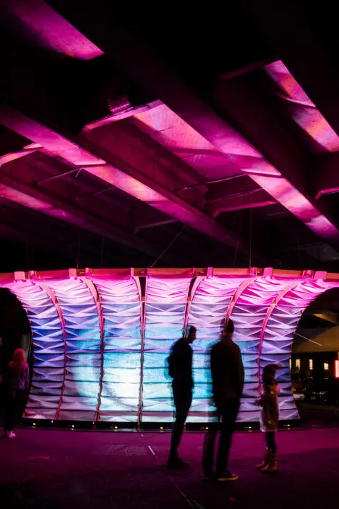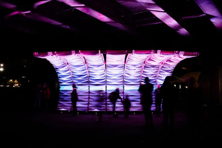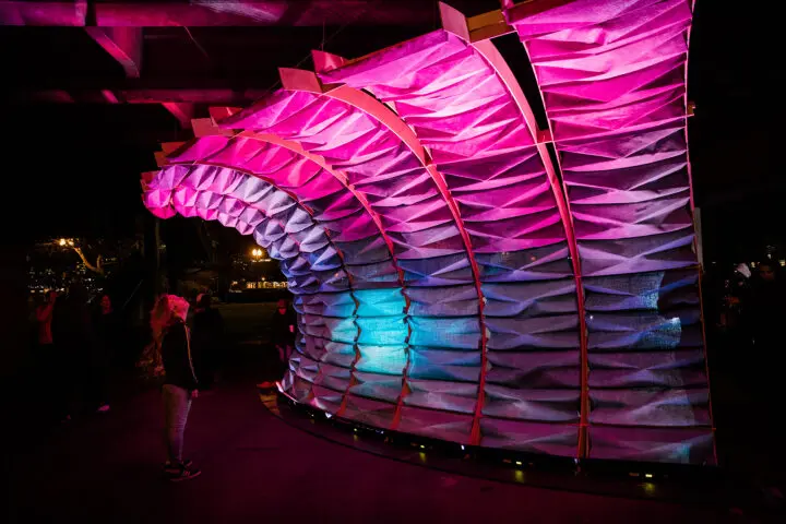 Located beneath the Hawthorne Bridge, this year’s installation, Technicolor Dreamboat, was a 12-foot, multi-colored wave that combined textiles, wood, and digital projections to create a dynamic installation visible from both sides of the Willamette River.