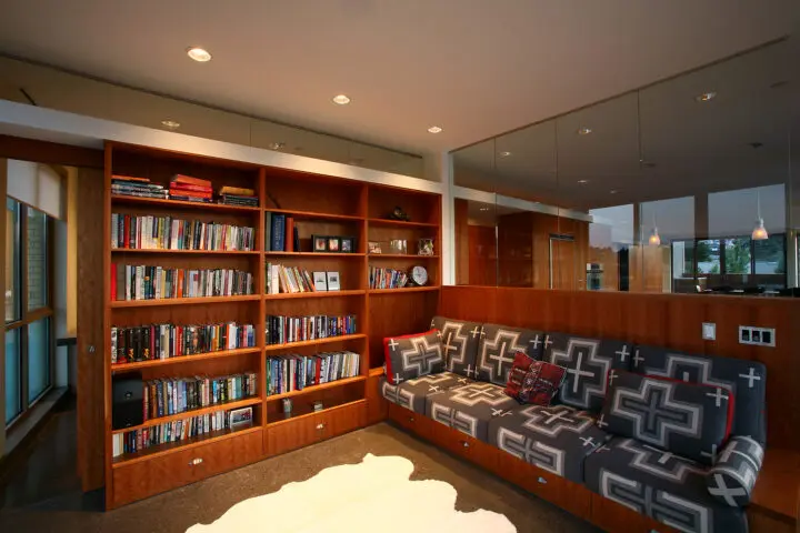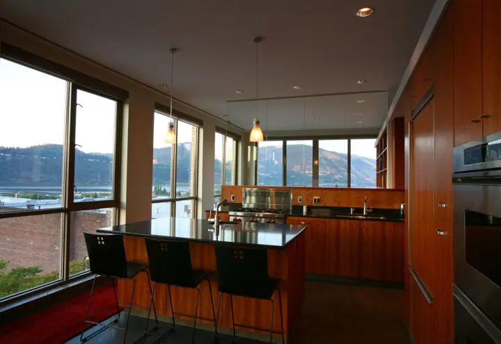The loft-style units incorporate floor-to-ceiling windows that provide ample natural light and views of the neighborhood, the Gorge, and Mt. Adams. Cherry wood is used throughout the units, from custom-designed fireplaces to a built-in reading nook with a couch and shelves. Concrete slab floors feature radiant heating.
