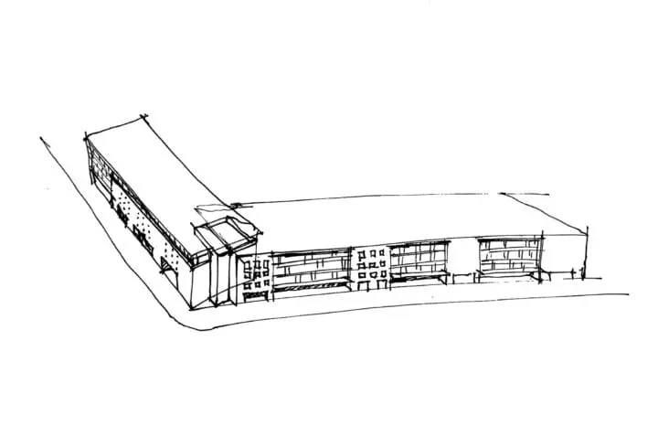 The building’s angled shape respects the existing neighborhood scale, creates a new public courtyard, and acts as a buffer from Foster Road.