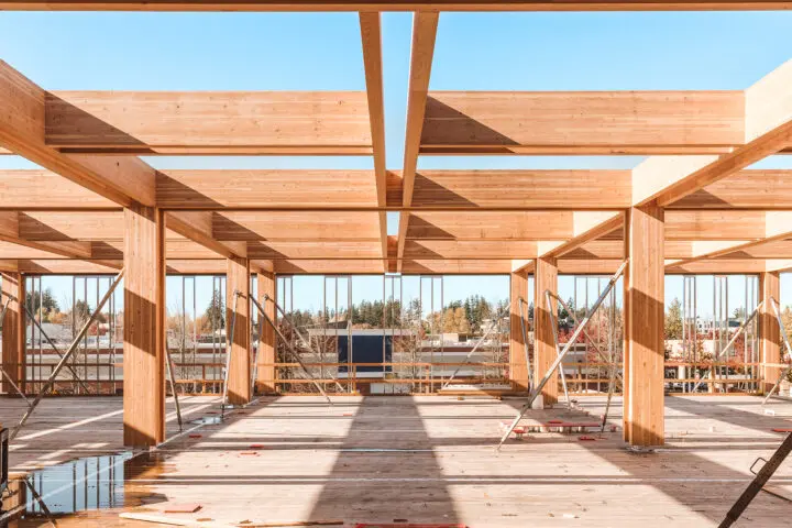 The new East County Library emulates a sense of wonder, refuge, and exploration that the Pacific Northwest’s forests evoke. Inspired by Native architecture, the design is connected to place in its use of local, natural materials. Mass timber forms the structure of the building from columns to roofline, matched by a wood-filled interior of paneled walls, storefronts, and balustrades.