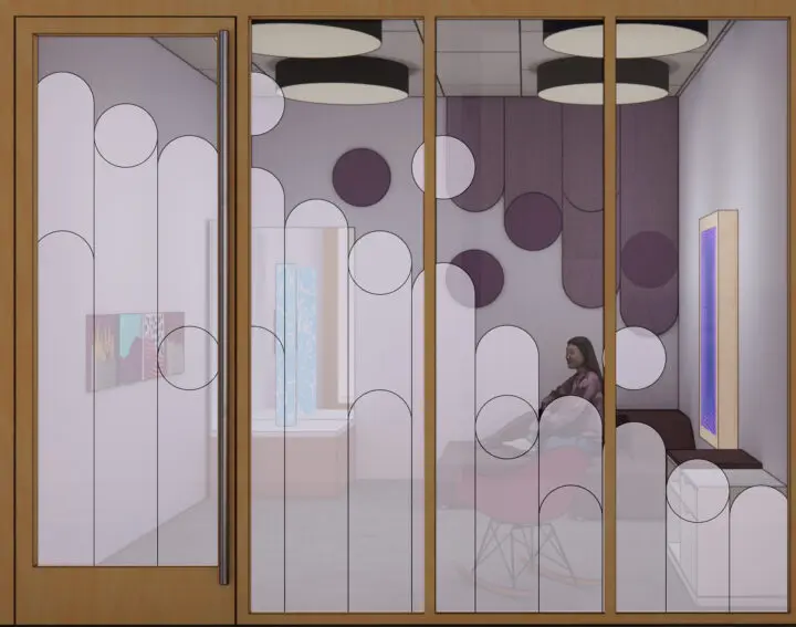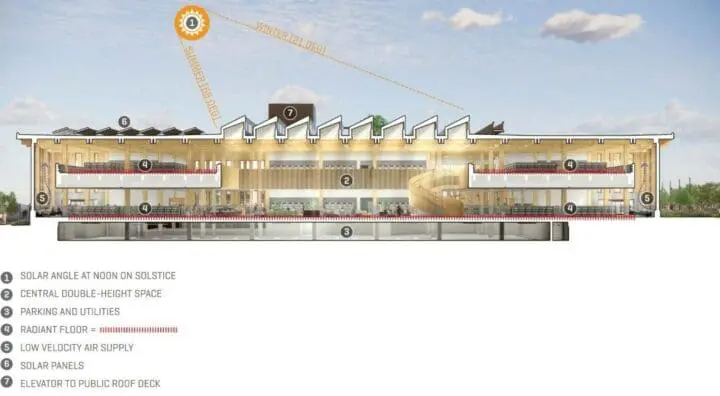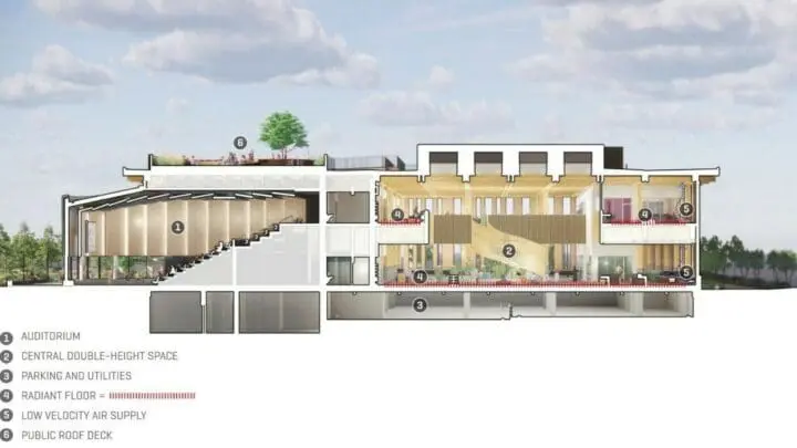 The building’s program forms a gradient of uses from engaging to exploratory to focused. To the west, the main entries and an array of active programming engage the central pedestrian path, including a makerspace, 230-seat auditorium, indoor-outdoor children’s play area, and dedicated teen space. This active zone intersects a more exploratory zone at the library’s core with its vast collection of books and specialized programming, from community and sensory rooms to an audio-visual recording studio. Finally, comfortable, window-lined seating defines the east side of the building for a more focused reading zone and workspace, completing this programmatic gradient.