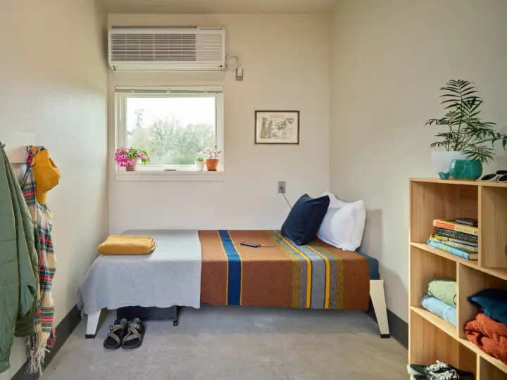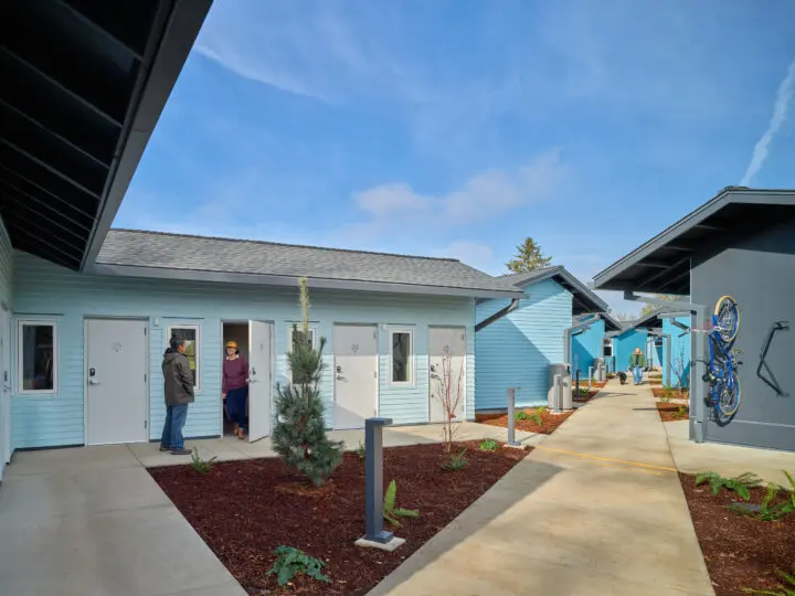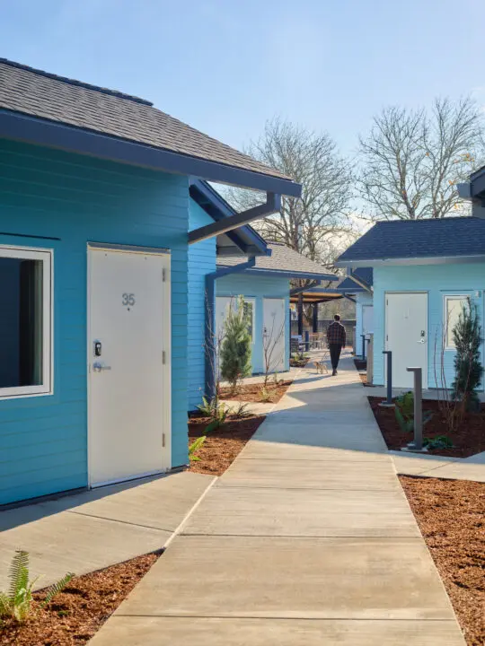 Located on the western edge of Hillsboro, Oregon, the Hillsboro Year-Round Shelter provides congregate and non-congregate sleeping solutions and services for people experiencing houselessness.