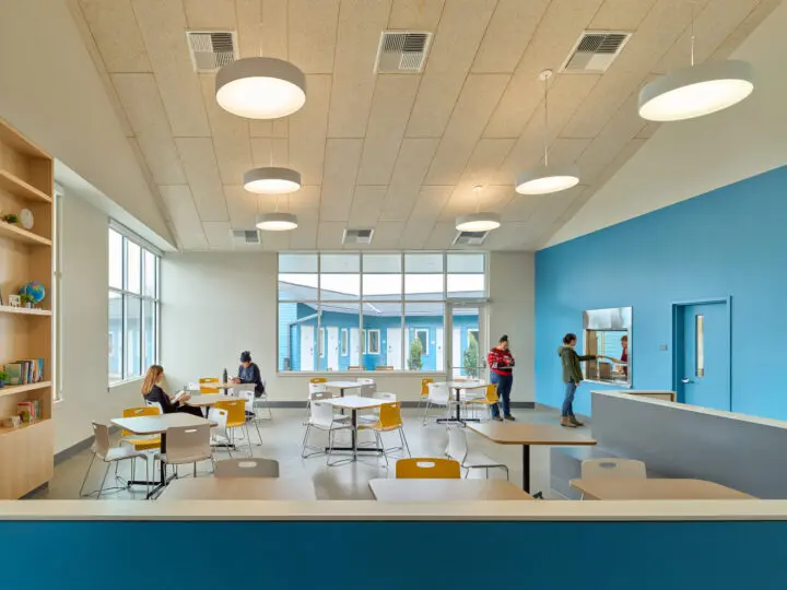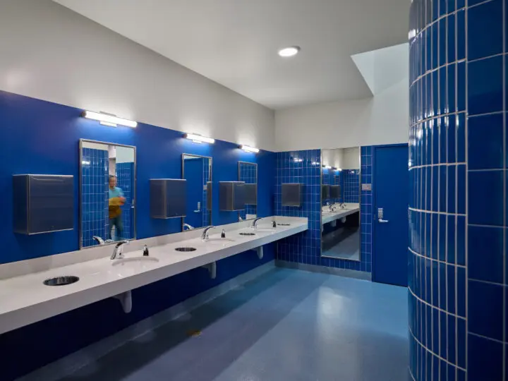 Hillsboro Shelter’s main building provides 36 shelter beds—each located in its own individual alcove and equipped with a light, charging station, storage, and a curtain for privacy. Here, a dining room serves dual purpose as a community lounge and a coffee bar, providing guests with coffee and snacks throughout the day. A quiet room is available to aid in de-escalation and provide a space for solitude. The restrooms are designed for maximum safety and privacy, with individual shower and toilet rooms instead of stalls.