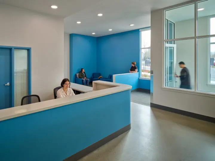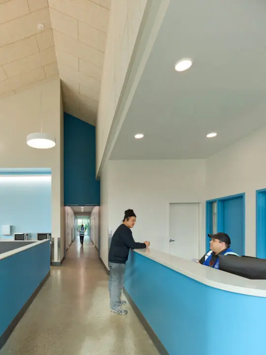 Trauma-informed design principles were implemented throughout the project to ensure that the Shelter is a safe and comfortable space for people to get back on their feet. Easy wayfinding and clear circulation informed both the layout of the site as well as the interiors. Wide corridors, no dead ends, and multiple exits support safety for staff and guests. The color palette is comprised of cool tones to provide a calming space, and windows provide natural light. Outside, lush landscaping was thoughtfully designed to create open places for gathering as well as more private, quiet spaces for respite. Large trees create a wooded feel in an urban environment.