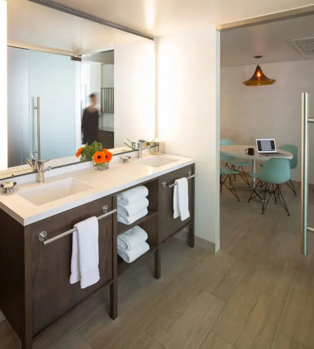 The design prioritizes the guest experience. Corner rooms were combined to make spacious suites, and all rooms were finished with floor-to-ceiling windows that maximize a spacious feeling and provide ample natural light. Custom curtains abstracted from a photo of the hotel’s first days give every room an artistic focal point.