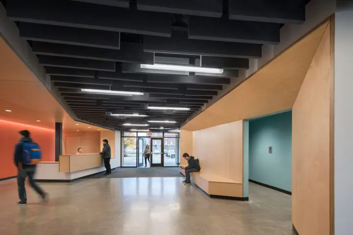 The project’s heart is an open, central student lounge, which provides study space and plenty of room for gathering.