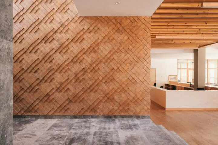 It was critical that the building took on traditional architectural forms due to the cultural significance of the campus. On the interior, the layout took inspiration from circulation patterns of dzongs, a traditional Bhutanese fortress, which typically has a circuitous central area. A central stair serves as a focal point in the space, which connects the library’s three floors and features a wooden “mosaic” wall arranged to evoke the notion of an intricate textile pattern.