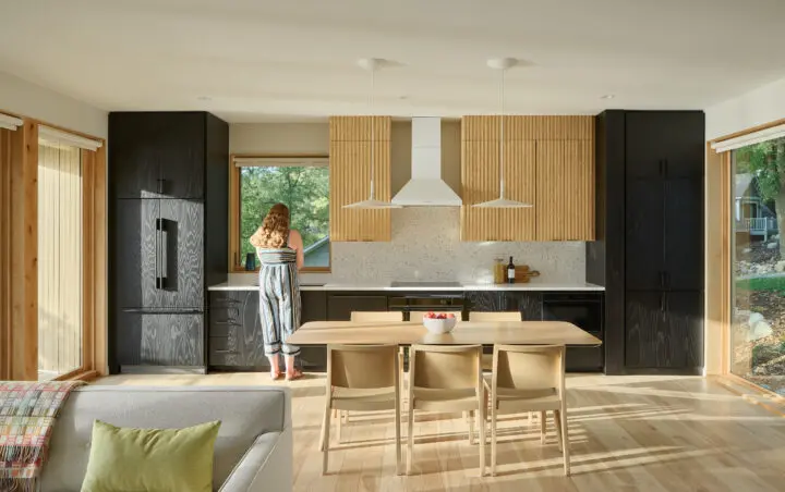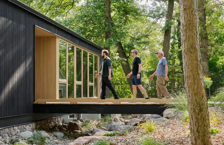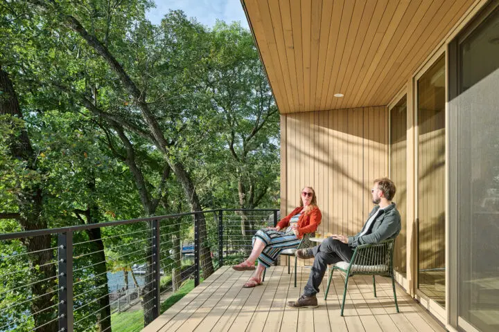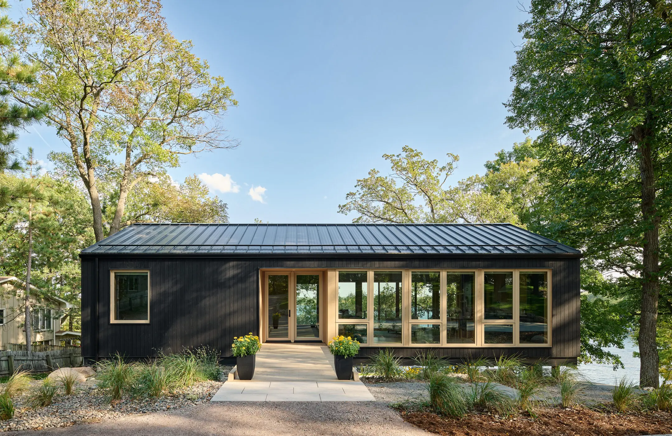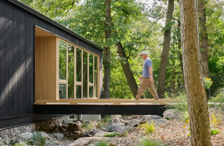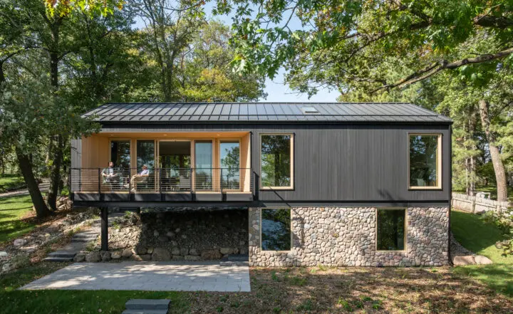 Along the bluffs of Lake Sylvia in South Haven, Minnesota, Lake Sylvia Retreat is a modern but humble getaway for a family and their guests. A renovation and addition, the new building expands off the footprint of the existing cabin, leaving the site’s topography unaltered. In this way, the design lives light on the land, respecting the environment and maximizing lake views.