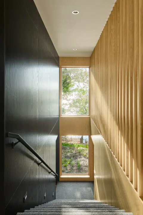 The cabin’s materials draw inspiration from the environment—dark wood on the exterior blends with the surrounding trees. A bridge to the entry creates the illusion that the house is floating above the bluffs, and large windows offer transparency, panoramic lake views, and ample natural light. The lower floor integrates seamlessly into the surrounding landscape with matching stone wrapping the exterior.