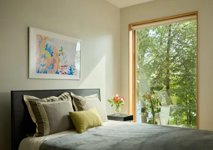 The cabin’s floor plan is arranged around a central stair that connects the building’s two levels. On the main floor, an open kitchen, dining, and living room provide ample space for generations of the family to gather. A balcony creates a relaxing space to unwind and enjoy views of the lake. The downstairs features a bunk room for the grandkids and access to a patio that is nestled among the lush lakefront.
