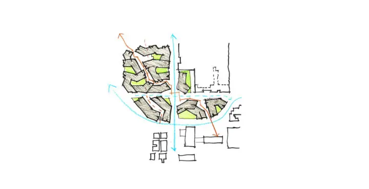 A central pedestrian thoroughfare bisects the site diagonally to maintain easy access to mass transit.