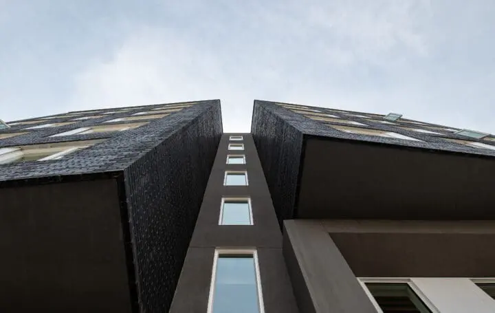 A quiet color scheme accentuates the sculptural form of the building while unifying its distinct volumes. High-quality materials include brick walls above a board-formed concrete or tile/stucco base; perforated metal screens and corten steel planters that provide privacy at ground-level units; wood decking; and wood accents in communal spaces.