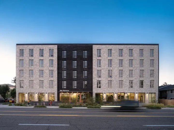 At The Aurora, it would’ve been easy (and cheaper) to copy the type of housing ubiquitous in the area: mostly 3-4-story suburban apartment buildings, much of which are characterless and in need of repair. However, the design team was sensitive to the fact that for many who live in the community, these buildings are evidence of being overlooked when it comes to meaningful public investment. Our Just Future envisioned a building that would improve its environment and communicate quality and longevity by forgoing affordable cladding materials like fiber cement siding. Brick was chosen for its durability and perceived aesthetic value, and care was taken to develop a façade that leveraged its permanence while creating a humane and welcoming street frontage. Other design measures included widening the existing 6-foot sidewalk along a very busy street to almost 25 feet in width and providing a buffer from traffic by adding planters full of local, drought-tolerant vegetation, bike parking, and a ramp for accessibility. This area is also decorated with subtle elements like awnings and steel fascia to provide visual interest and rain protection for people using the public space. Additionally, large openings to the interior of the building were designed to communicate warmth and a sense of welcome to passersby, and signage was developed by minority-led branding firm Odd Notion, which used inspiration from the beloved Su Casa Super Mercado across the street to show respect for the neighborhood.