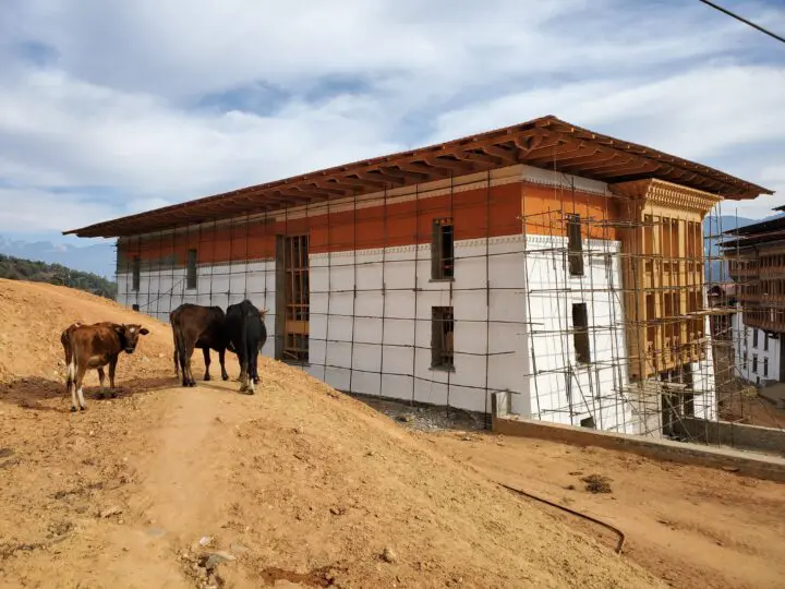 The primary campus broke ground in 2017, and the library followed in 2018. The pace of construction in Bhutan tends to be slower than what we’re accustomed to in the US, and unfortunately for everyone, the COVID-19 pandemic struck partway through. This presented the team in Bhutan with a very difficult problem. The Bhutanese construction industry is reliant on both migrant workers and materials from India. Bhutan, with its limited medical resources, took their lock-down very seriously. Crossing the border came with long delays and lengthy quarantine periods. It was difficult to get workers, who didn’t have the resources to cope with a long, unpaid lockdown, to come to Bhutan, especially when it was unknown how and when they could get back home. Even as the restrictions began to be lifted, the challenges with shipping and material availability felt here in the US were also impacting Bhutan. This resulted in significant delays that tripled the originally anticipated schedule.