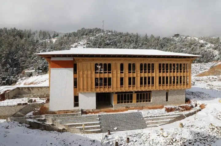 Together this team was to advise Wangchuk and Penjor on how to merge traditional aesthetics with modern insulation and air-sealing techniques for what was known as “PHASE I” and to design the Library. Hewing closely to tradition was especially critical because of the association of the school to the Bhutanese royal family. Named for the beloved Fourth King of Bhutan who abdicated the throne in 2006 in favor of his son, and presided over by his daughter, the President of Bhutan National Legal Institute, Her Royal Highness Princess Sonam Dechen Wangchuck, the law school has significant ties to the royal family. As such, traditional architectural forms would be critical to signify the cultural significance of the campus.